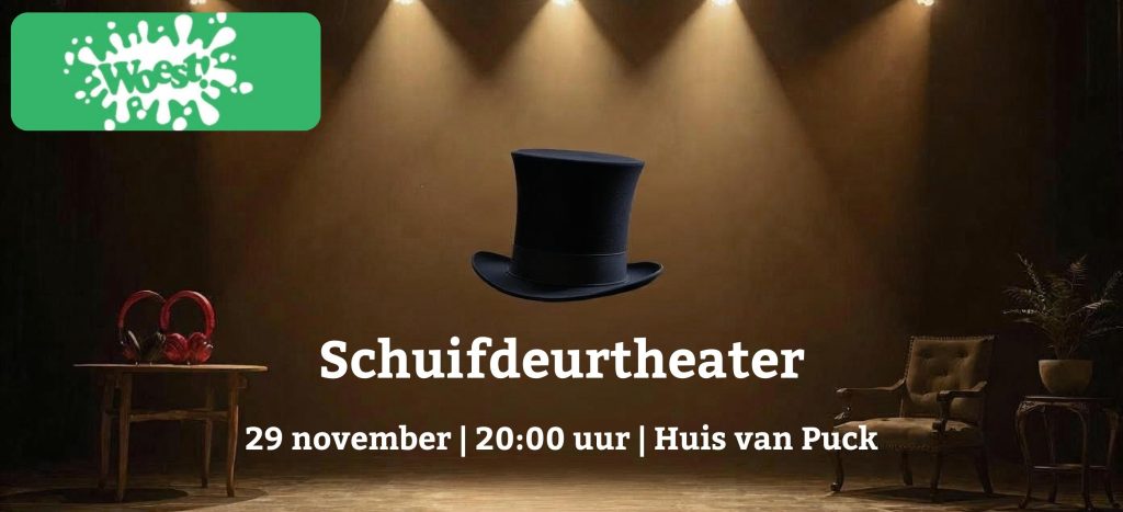 Wil je zelf ook eens het impro podium op? Grijp dan je kans en doe mee met schuifdeurtheater op zaterdag 29 november. Om 20.00u in Huis van Puck. Liever gewoon komen kijken op het pluche, dat kan ook! Koop jouw kaartje à €10 via de ticketservice: